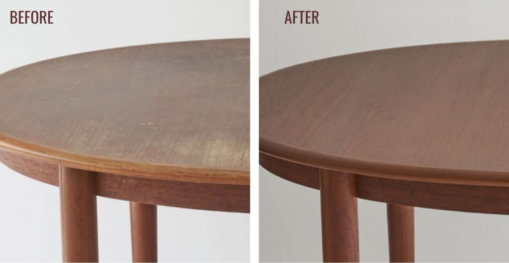 オイル仕上げの無垢材や突き板の天板は、紙やすりで削ってオイルを再塗装することでセルフメンテナンスができますが、経年劣化の激しいものやウレタン塗装、ラッカー塗装のものは、研磨と再塗装が必要です。コップの輪染みや焦げ、剥がれ、べたつきなどが生じた場合も、研磨と再塗装で見違えるように美しくなります。