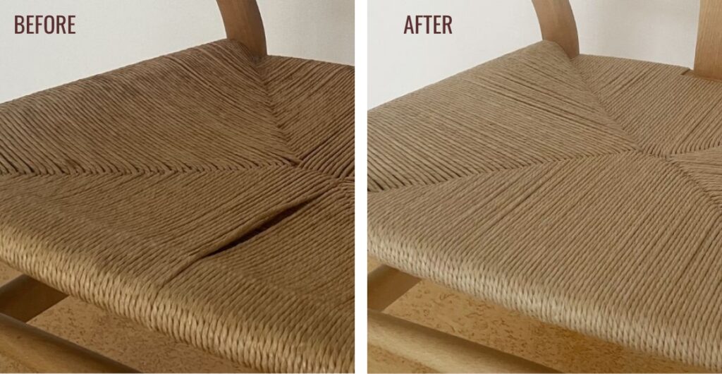 カールハンセン社のCH24(Yチェア)をはじめとする北欧の椅子にはペーパーコードが多く使われています。手作業で編まれたペーパーコードの座面は永く使ううちに解けたり切れたりしますが、張替えの専門家によって、個々の椅子で異なる座面の編み方を再現し元通りにいたします。また、木部の研磨も承ります。