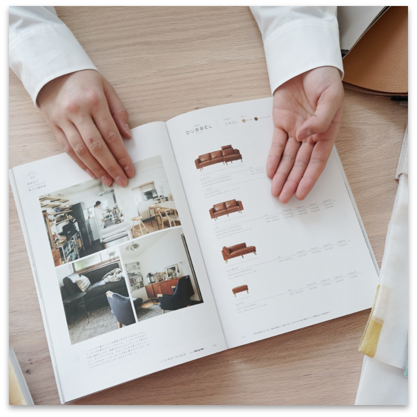 サイズや色、異なる商品での配置などをその場で最終確認しながら、間違いのない家具選びができるようにご提案いたします。