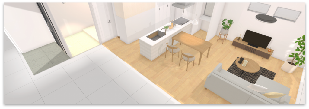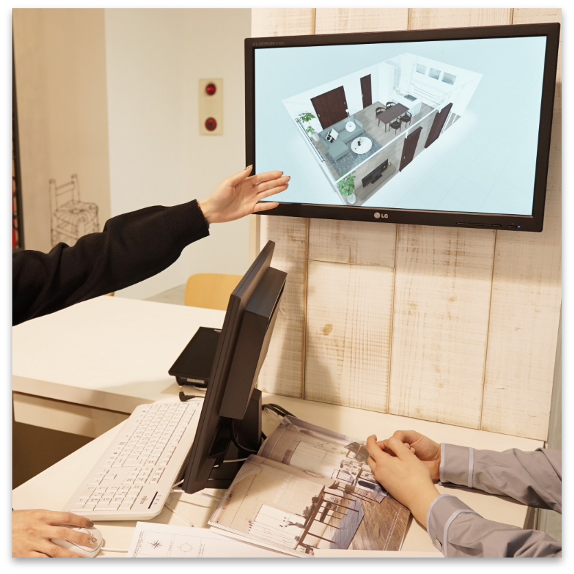 家具1つ1つのサイズや質感までもリアルに再現できるシュミレーション技術を用いて、図面からお部屋のサイズをリアルに可視化。