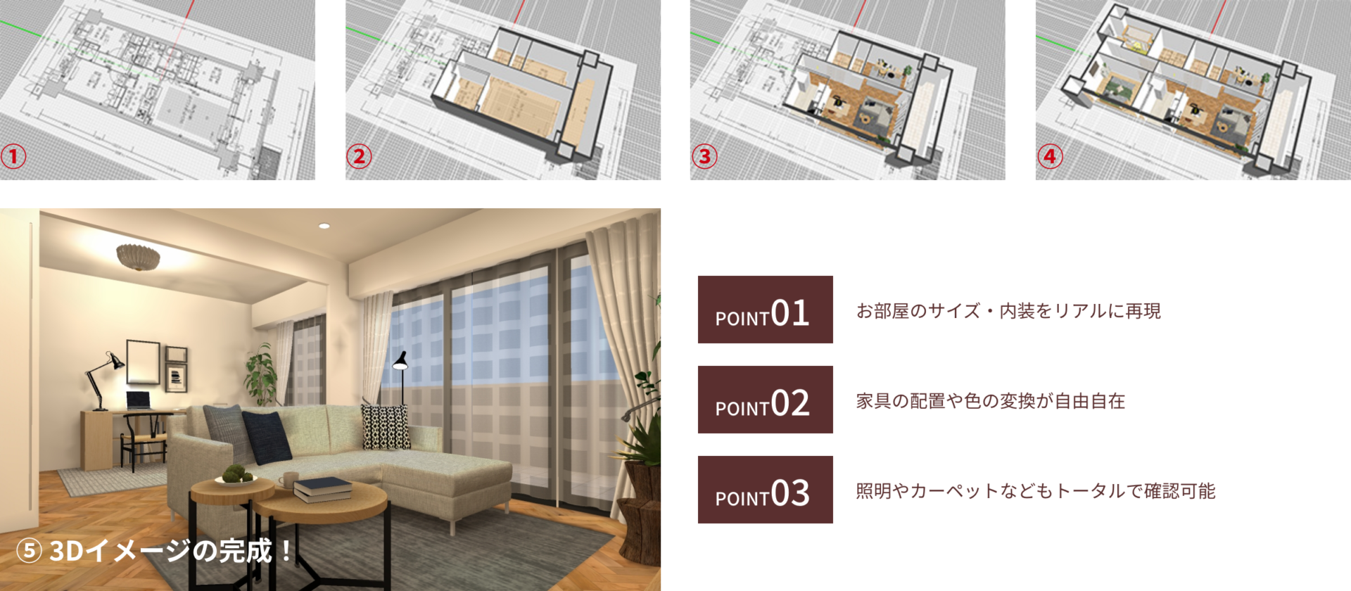 ご自宅に家具や照明などを配置したリアルなイメージを作成したプランでご確認いただきます。